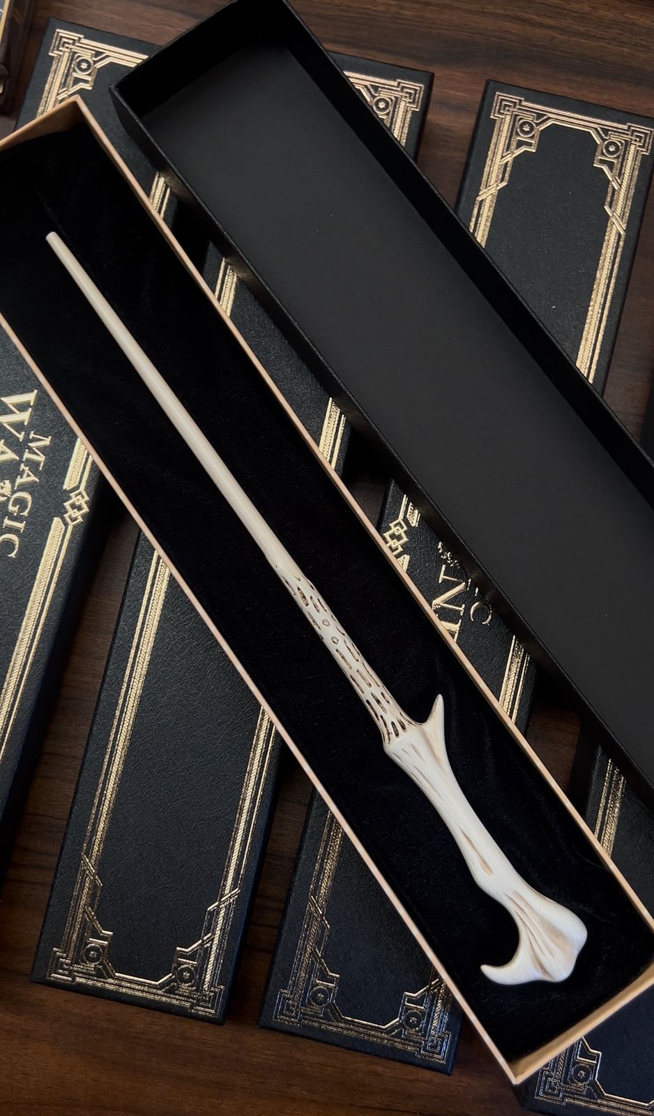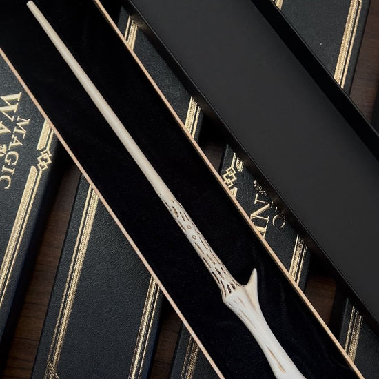 La varita mágica de Voldemort se caracteriza por su diseño largo y su empuñadura con forma ósea, símbolo de oscuridad y poder. Es conocida por su enorme potencia y por estar vinculada al núcleo de pluma de fénix, compartido con la varita de Harry Potter, lo que la convierte en una de las más temidas del mundo mágico.